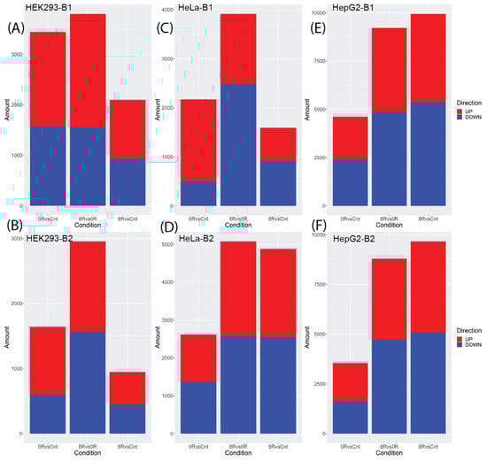 The Number of DEGs varies by Cell Line and Batch. Histogram depicting the number of DEGs (|log2 fold change| > 0.5; adjusted p-value < 0.05) in HEK293 (A,B), HeLa (C,D), and HepG2 (E,F) cell lines during heat shock for batch 1 (top rows) and batch 2 (bottom rows). The height of each bar represents the count of upregulated and downregulated genes, emphasizing the scale of transcriptional changes in response to heat shock. Note that the y-axis scale varies across panels to improve visualization of the differences in gene expression dynamics between cell lines and batches.