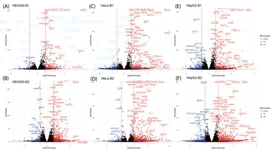 Volcano plots show the distribution of DEGs for condition comparisons within each cell line. Each point represents a gene, with the x-axis indicating log2 fold change (magnitude of expression change) and the y-axis representing statistical significance (negative log10 adjusted p-value). Genes upregulated (log2FC > 1) are shown in red, while downregulated genes (log2FC < −1) are in blue. Examples include HEK293 (A,B), HeLa (C,D), and HepG2 (E,F) comparisons at 0 h post-heat shock vs. control, visualizing the most significant transcriptional changes.