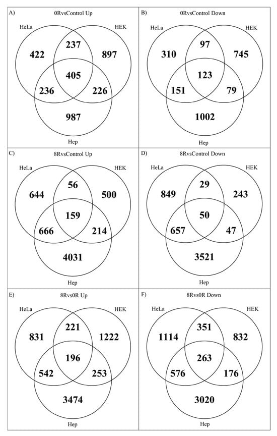 The next step involved identifying conserved genes shared between the cell lines to further elucidate the similarities in gene expression during mild heat shock across HeLa, HEK, and Hep cells. Conserved DEGs across all three cell lines and batches included 405 genes overexpressed at 0 h post-heat shock vs. Control, 196 genes overexpressed at 8 h post-heat shock vs. 0 h, and 159 genes overexpressed at 8 h post-heat shock vs. Control (Figure 5A,C,E).
