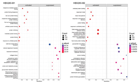 Dot plot visualization of Gene Set Enrichment Analysis (GSEA) results. The top 15 positively and negatively enriched gene sets, ranked by normalized enrichment scores (NES), are shown for HEK293 at 0 h post-heat shock vs. control (Batch 1 and Batch 2). Each dot represents a gene set, with size proportional to the number of enriched genes and color reflecting the statistical significance (adjusted p-value).