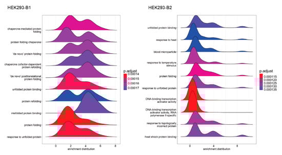 Enrichment maps (Figure 8 and Supplementary Figure S5C–F) visualized interactions among enriched gene sets. In HEK293, gene sets related to protein folding and heat shock response formed cohesive clusters. In HeLa and HepG2, fewer interconnections were observed, with unexpected enrichments in immune-related pathways, such as B cell-mediated immunity and immunoglobulin receptor binding, in HepG2.