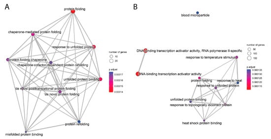 Enrichment maps of the top 10 positively enriched gene sets (GSEA NES) for HEK293 cells at 0 h post-heat shock vs. control. Each node represents a gene set, with edges indicating shared genes between sets. The network visualizes functional overlap and relationships among the most significant pathways for each batch. (A) protein folding and (B) protein folding and DNA-binding transcription activator activity).