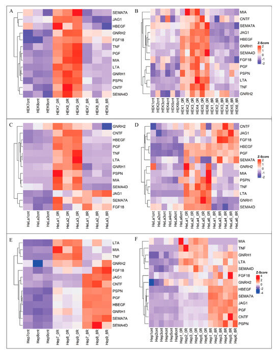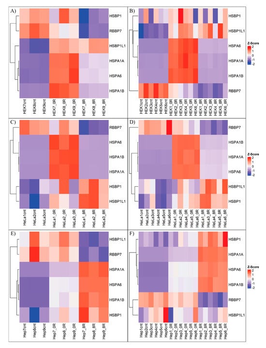 Figure 11 summarizes the expression changes in HEK293 (Figure 11A,B), HeLa (Figure 11C,D), and HepG2 (Figure 11E,F) cell lines across batches and conditions. These results strongly support the activation of the heat shock response. HSPA1A, HSPA1B, and HSPA6 were consistently upregulated across all cell lines, while RBBP7 was downregulated. However, expression patterns of HSBP1 and HSBP1L1 varied. In HEK293 cells, HSBP1 decreased at 0- and 8-h post-heat shock, whereas it increased in HeLa and HepG2 cells under the same conditions. Conversely, HSBP1L1 increased in HEK and HeLa cells but exhibited batch-specific behavior in HepG2, decreasing in Batch 1 at 8 h and remaining unchanged in Batch 2. Despite this variability, the consistent expression trends of HSPA1A, HSPA1B, HSPA6, and RBBP7 across all conditions underscore the canonical activation of the heat shock response.