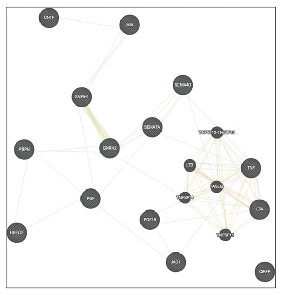 Network Map of GO:0048018 Pathway Genes. Cytoscape-generated network map of the 13 conserved DEGs within the Signal Receptor Ligand Activity (GO:0048018) pathway. Nodes represent genes, and edges indicate predicted functional interactions, offering a systems-level view of pathway dynamics.