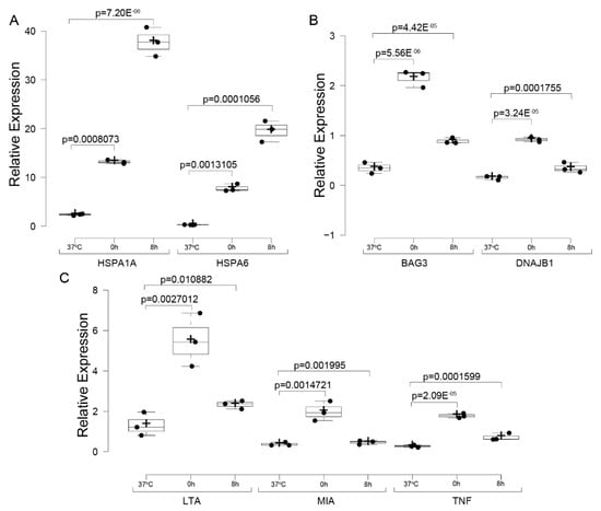 qPCR analysis was further performed on mRNA from HeLa cells at 0- and 8-h post-heat shock, along with control samples maintained at 37 °C. The primers targeted four “Heat Acclimation” genes (HSPA1A, HSPA6, BAG3, DNAJB1) and three “Signal Receptor Ligand Activity” genes (LTA, MIA, TNF), with ACTB and GAPDH as reference controls.