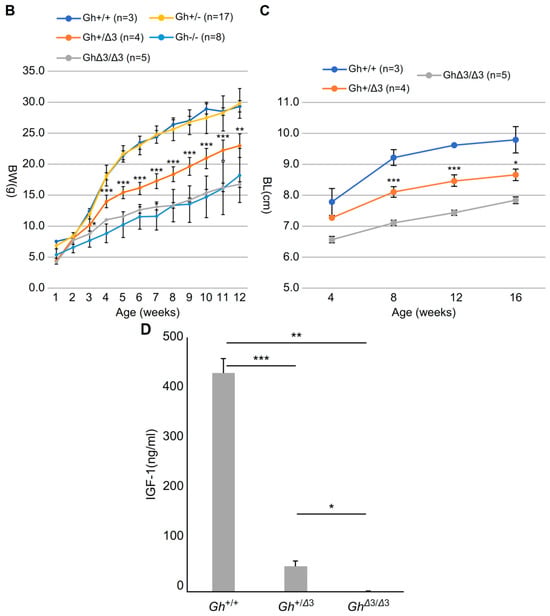 A schematic representation of the wild-type allele and the mutant allele generated using the CRISPR/Cas9 system is shown in Figure 1A. Growth curves of body weight and length for wild-type (Gh+/+), IGHD2 mice model (Gh+/Δ3), homozygous Δ3 allele mice (GhΔ3/Δ3), heterozygous Gh deletion mice from a previous study using homologous recombination (Gh+/−), and Gh KO mice (Gh−/−) are shown in Figure 1B,C. Gh−/− mice demonstrated severe postnatal growth retardation, indicating that, as in humans, postnatal growth in mice is GH-dependent. Gh+/Δ3 mice exhibited moderate growth retardation, consistent with the IGHD2 phenotype, and were significantly smaller than Gh+/- mice but larger than Gh−/− mice. No transcripts other than exon 3-skipped Gh transcripts were produced from the genome-edited GhΔ3 allele. GhΔ3/Δ3 mice displayed growth impairment consistent to that of Gh−/− mice, aligning with in vitro data showing that Δ3 GH is not secreted extracellularly. IGF-1 levels in Gh+/Δ3 mice were also markedly lower than those in wild-type, suggesting that the observed phenotype is due to GH deficiency (Figure 1D).