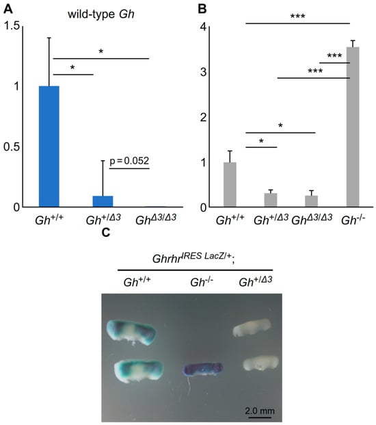qRT-PCR analysis of (A) wild-type Gh and (B) Ghrhr mRNA levels using pituitary samples from model mice at 4 weeks of age. (C) Results of X-gal staining of pituitary glands from 4-week-old Ghrhr+/IRES-LacZ; Gh+/+, Ghrhr+/IRES-LacZ; Gh+/Δ3, and Ghrhr+/IRES-LacZ;Gh−/− mice. * p < 0.05, *** p < 0.005. Scale bar, 2 mm.