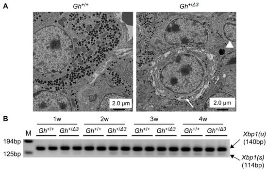 To evaluate the effects of Δ3 mGH on somatotrophs, electron microscopy imaging of the pituitary glands in 4-week-old mice was conducted. In the pituitaries of Gh+/+ mice, numerous secretory granules and a moderately developed ER were observed. In contrast, Gh+/Δ3 mice displayed marked expansion of the ER, a reduction in secretory granules, and high electron density protein aggregates within the cytoplasm contiguous with the ER membrane (Figure 3A). These findings suggest that, similar to Δ3 hGH, Δ3 mGH localizes to the ER and may subsequently undergo degradation in the cytoplasm. Additionally, the accumulation of Δ3 mGH in the somatotroph ER may induce ER stress.