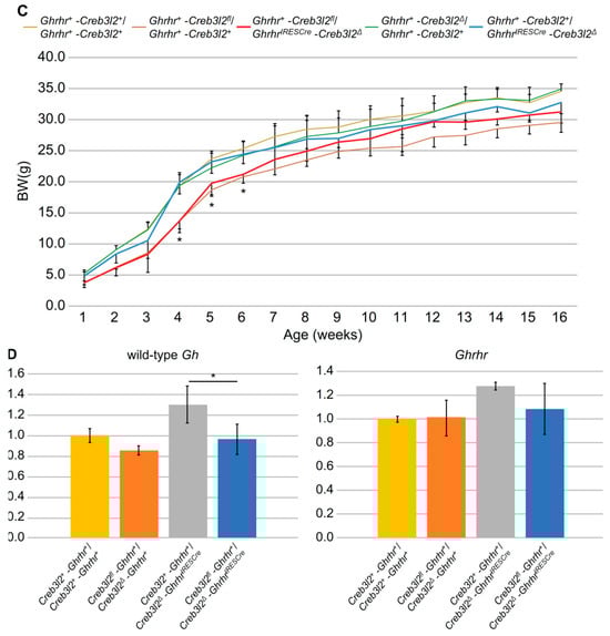 In our previous study, the Creb3 family, which localizes to the ER and, upon cleavage of its N-terminus, acts as a nuclear transcription factor within the nucleus was focused and studied []. In the humanized IGHD2 model mice, nuclear CREB3L2 levels were reduced and CREB3L2 was identified as a novel nuclear transcription factor that binds to the promoter region of the Ghrhr gene. This indicated that Δ3 hGH could potentially inhibit Ghrhr mRNA transcription via a reduction in nuclear CREB3L2 protein, which might contribute to the dominant-negative effect observed in this condition. If this hypothesis were correct, then Creb3l2 KO mice should also exhibit similar growth defects due to a reduction in Ghrhr mRNA levels. Since Creb3l2 KO mice die shortly after birth [], somatotroph-specific Creb3l2 KO mice was created for the purpose of investigating this phenomenon in vivo (Supplementary Figures S1 and S2A,B). The results showed that the somatotroph-specific Creb3l2 KO mice did not exhibit growth defects (Figure 3C), and neither Ghrhr mRNA nor Gh mRNA levels were reduced (Figure 3D). These findings confirm that a reduction in nuclear CREB3L2 is not the cause of the dominant-negative effect in this condition.