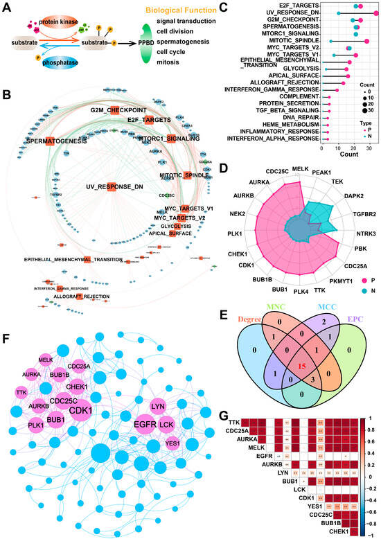 Identification of hub PPMEs in the PPI network that are significantly correlated with pathway activity. (A) Overview of the reversible and dynamic process of phosphorylation modification mediated by PPMEs and its underlying biological functions. (B) The network diagram between cancer hallmark-related pathways and PPMEs in LUAD. In the diagram, a red edge represents a significant positive correlation and a green edge represents a significant negative correlation. The size of nodes and fonts is proportional to the degree. (C) Number of PPMEs significantly associated with cancer hallmark-related pathways. Red indicates a positive correlation and green indicates a negative correlation. (D) The radar plot shows the number of cancer hallmark-related pathways that are significantly correlated with PPMEs, with red representing positive correlations and green representing negative correlations. (E) Venn diagram of the top 20 PPMEs in the four topological algorithms. (F) PPI network diagram of hub PPMEs. The size of a node is proportional to its degree. (G) Heatmap of correlations between hub PPMEs. * indicates a p-value less than 0.05, ** indicates a p-value less than 0.01.