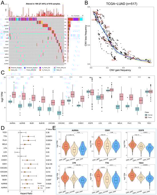 To investigate the genomic characteristics of hub PPMEs in LUAD, we first confirmed the somatic mutation frequency of hub PPMEs. The results showed that 27.44% of the 616 samples exhibited mutations in the hub PPMEs. Among them, the primary mutation type of hub PPMEs was the missense mutation, and EGFR (14%) had the highest mutation frequency (Figure 2A). The study results of CNV frequency showed that hub PPMEs have a wide range of CNV alterations. In particular, BUB1B, AURKB, TTK, CDC25A, and MELK had extensive copy number loss, while LYN, AURKA, and EGFR had widespread copy number amplification (Figure 2B). Subsequently, we explored the transcription and protein expression patterns of hub PPMEs in healthy lungs, and the results showed that EGFR, LCK, LYN, YES1, CDK1, and PLK1 all had high transcription and protein expression levels, indicating that they were not or less affected by post-transcriptional regulation. It is worth noting that TTK was almost not expressed at the transcriptional level but had a high protein expression level, which means that the protein expression level of TTK is largely determined by post-transcriptional regulation (Supplementary Materials Figure S1). The expression perturbation results of hub PPMEs between normal and cancer samples revealed that hub PPMEs were significantly different between normal and cancer samples, except EGFR, LCK, and YES1, and they had higher expression levels in cancer samples (Figure 2C). We further used a cox regression analysis to evaluate the clinical relevance of hub PPMEs, revealing that 11 of these hub PPMEs were identified as risk factors for patient survival (Figure 2D). Interestingly, these 11 hub PPMEs have frequent protein–protein interactions and high expression correlations (Figure 1F), suggesting potential co-operation among them. In order to explore the factors of hub PPME expression disturbance in cancer samples, we calculated the correlation between CNV frequency and gene expression. The results indicate significant correlations between the expression levels of AURKA, AURKB, BUB1, BUB1B, CDK1, CHEK1, EGFR, LYN, MELK, TTK, and YES1 with their CNV gain or loss frequencies, implying that CNV may be one of the factors contributing to hub PPME expression perturbation (Figure 2E). In conclusion, this analysis highlights the high heterogeneity of hub PPMEs in both normal and cancer samples, in terms of genetic and expression alterations. This suggests a crucial role for these hub PPMEs in the occurrence and progression of LUAD.