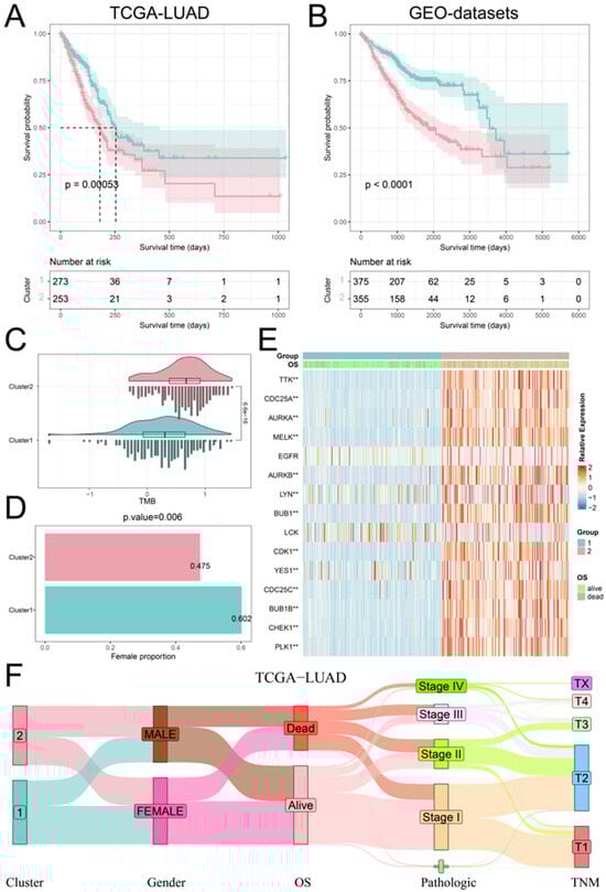 We executed a consistent cluster analysis of LUAD patients based on the expression of hub PPMEs to investigate their influence on patient classification. According to the cumulative distribution function (CDF) diagram and the consensus matrix, we determined that two categories provide the optimal segmentation for the TCGA-LUAD cohort (Supplementary Materials Figure S2A). Subsequently, the LUAD patients were divided into two phosphorylation modification subtypes: cluster1, consisting of 273 cancer samples, and cluster2, comprising 253 samples (Supplementary Materials Table S3). The survival analysis showed that patients with LUAD in cluster1 had higher overall survival compared to those in cluster2 (Figure 3A). It is worth noting that we used the same method to analyze the GEO-datasets cohort containing 730 LUAD patients. The results were similar to those of the TCGA-LUAD cohort. The optimal classification number of LUAD patients was identified as two and the patients in cluster1 had a higher overall survival rate than those in cluster2 (Figure 3B; Supplementary Materials Figure S2B; Supplementary Materials Table S4). We compared the tumor mutation burden (TMB), gender distribution, expression perturbations, and pathological stages of patients in cluster1 and cluster2 to understand the reasons for the higher overall survival rate of patients in cluster1. Compared with patients in cluster1, patients in cluster2 have a higher tumor mutation burden, which means that the high tumor mutation burden may be one of the reasons for the poor prognosis of patients (Figure 3C). Furthermore, the proportion of female patients in cluster1 was significantly higher than that in cluster2 (Figure 3D). The differential analysis of hub PPMEs between clusters demonstrated significant differences in 13 hub PPMEs between clusters 1 and 2 among the two cohorts. Notably, all 13 hub PPMEs had higher expression levels in cluster2, suggesting that the expression disorder of hub PPMEs contributes to the increased mortality rate observed in patients (Figure 3E; Supplementary Materials Figure S3). The association between phosphorylation modification subtypes and multiple clinical features in the TCGA-LUAD cohort is shown in Figure 3F. The above analysis indicates that hub PPMEs can divide LUAD patients into different phosphorylation modification subtypes. High tumor mutation burden and dysregulated expression of hub PPMEs are the potential risk factors that contribute to poor prognosis in LUAD.