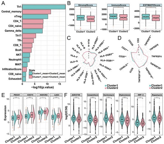Immune characteristics of distinct phosphorylation modification subtypes. (A) The abundance of immune cells was significantly different between phosphorylation modification subtypes. (B) Stromal score, immune score, and ESTIMATE score in phosphorylation modification subtypes. ** represents p-value of less than 0.01. (C) Radar graph of median expression of major histocompatibility complex between subtypes. (D) Radar diagram of median expression of T-cell stimulators between subtypes. (E) The expression of immune checkpoint molecules in two phosphorylation modification subtypes. (F) The drug sensitivity of six cancer therapeutic drugs in two phosphorylation modification subtypes. * represents p-value of less than 0.05, ** represents p-value of less than 0.01, *** represents p-value of less than 0.001, and **** represents p-value of less than 0.0001.