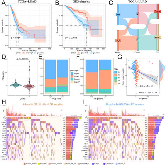 Construction and characterization of PSig scores. (A,B) Kaplan–Meier curves demonstrate survival differences between high PSig score and low PSig score groups. (A) The TCGA-LUAD cohort. (B) The GEO-datasets cohort. (C) The relationship between PSig score and phosphorylation modification subtypes. (D) The difference of PSig scores across phosphorylation modification subtypes. (E) The proportion of patients with different pathological stages in the high PSig score and low PSig score groups. (F) The percentage of patients at different stages in the high PSig score and low PSig score groups. (G) The correlation between PSig score and tumor mutation burden. (H) The waterfall diagram of the first 20 high-frequency somatic mutation genes in the high PSig score group. (I) The waterfall diagram of the first 20 high-frequency somatic mutation genes in the low PSig score group.