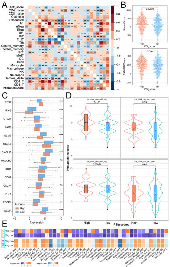 Clinical relevance of PSig scores. (A) The correlation heatmap between the PSig score and immune cell abundance. Red represents a positive correlation; blue represents a negative correlation. * represents a p-value below 0.05 and ** represents a p-value below 0.01. (B) The stromal score and the ESTIMATE score between the high PSig score group and the low PSig score group. The Wilcoxon rank sum test was used to test whether the difference between groups was significant. (C) The expression levels of 14 immune checkpoint-related genes in the high PSig score group and low PSig score group. The Wilcoxon rank sum test was used to test the statistical difference between the groups. * represents a p-value of less than 0.05, ** represents a p-value of less than 0.01, *** represents a p-value of less than 0.001, **** represents a p-value of less than 0.0001, and ns represents no significant difference. (D) The distribution map of immunophenoscore in the high PSig score group and the low PSig score group. (E) IC50 distribution heatmaps of significantly different drugs in the high PSig score group and the low PSig score group.