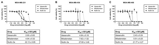 Analysis of cell viability in TNBC cell lines after incubation with murine double minute 2 (MDM2) inhibitors. MDA-MB-231 (A), MDA-MB-436 (B), and MDA-MB-468 (C) were seeded and incubated for 24 h before treatment. Idasanutlin, Milademetan, or Nutlin-3a were added at the displayed concentrations and incubated for 72 h. Treatment was repeated for another 72 h. Subsequently, cell viability was determined using the CellTiter-Glo assay. The graphs show the mean ± SD n ≥ 3. Tables below the graphs contains the summarized IC50 values ± SD.