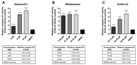MDA-MB-231 cells were treated with toxic concentrations of Idasanutlin, Milademetan, and Nutlin-3a (up to an 8-fold increase of the corresponding IC50 concentration). As shown in Figure 2, the caspase-3/7 activity of cells treated with 4 to 16 µM Idasanutlin was 1.81 ± 0.03-, 4.54 ± 0.05-, and 5.47 ± 0.4-fold compared to vehicle control (DMSO). Similarly, for Milademetan, caspase-3/7 activity was 4.32 ± 0.11-, 4.64 ± 0.21-, and 4.54 ± 0.67-fold higher compared to vehicle control when treated with 8.08 to 32.32 µM of the compound. For Nutlin-3a, serving as reference, 1.69 ± 0.11-, 3.49 ± 0.21-, and 4.69 ± 0.51-fold increases in caspase-3/7 activity compared to vehicle control were detected when cells were treated with 22.13 to 88.52 µM of the compound.
