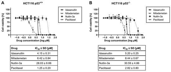 Effect of murine double minute 2 (MDM2) inhibitor Nutlin-3a on cell viability in HCT116 p53+/+ and HCT116 p53−/− cells. HCT116 p53+/+ (A) and HCT116 p53−/− (B) cells were seeded and incubated for 24 h before treatment. Nutlin-3a or Paclitaxel was added at the displayed concentrations and incubated for 72 h. Treatment was repeated for another 72 h. Subsequently, cell viability was determined via the CellTiter-Glo assay. The graphs show the mean ± SD n ≥ 3. Tables listed below the graphs contain the summarized IC50 values ± SD.