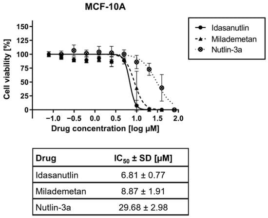 Viability studies of MDM2 inhibitors in non-malignant MCF-10A cells. MCF-10A cells were seeded and incubated for 24 h before treatment. Idasanutlin, Milademetan, or Nutlin-3a were added at the displayed concentrations and incubated for 72 h. Treatment was repeated for another 72 h. Subsequently, cell viability was determined via the CellTiter-Glo assay. The graph shows the mean ± SD n ≥ 3. The table below the graph contains the summarized IC50 values ± SD.