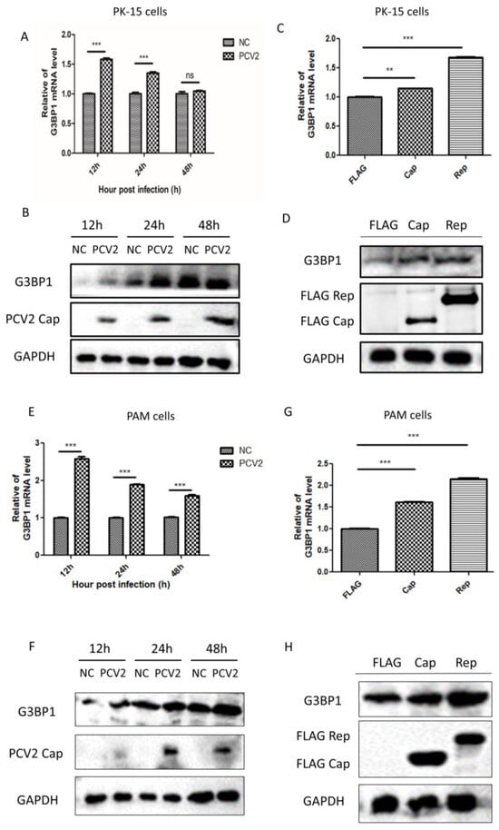 PCV2 infection significantly promotes the expression of G3BP1. (A,B) Infection of PK-15 cells with PCV2 increased both the mRNA and protein levels of G3BP1. (C,D) PCV2 Cap and Rep protein-transfected PK-15 cells promote the expression of G3BP1 mRNA and protein level. (E,F) PCV2 infection of PAM cells promoted the mRNA and protein expression of G3BP1. (G,H) PCV2 Cap and Rep protein transfected PAM cells to promote the expression of G3BP1 mRNA and protein level. ** p < 0.01. *** p < 0.001 “ns” means no statistical significance.