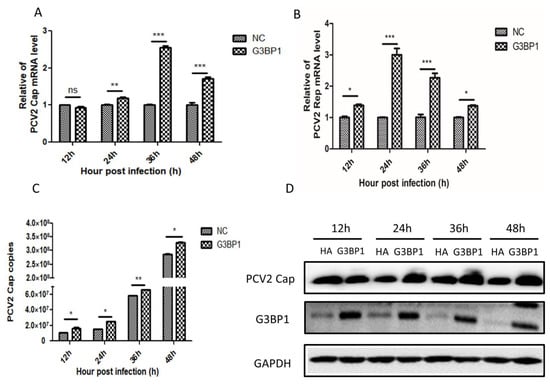 Overexpression of G3BP1 promotes PCV2 replication. (A,B) The overexpression of G3BP1 in PK15 cells promoted the expression of PCV2 Cap and Rep mRNA at different time points. (C) Effect of overexpression of G3BP1 on PCV2 gene copy number in PK15 cells. (D) Overexpression of G3BP1 in PK15 cells promoted the expression of PCV2 Cap protein. * p < 0.05, ** p < 0.01. *** p < 0.001 “ns” means no statistical significance.