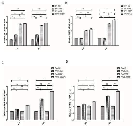 G3BP1 promotes PCV2-induced expression of RIG-I, MDA5, MAVS, cGAS, and STING. (A,B) Overexpression of G3BP1 in PK15 cells promotes PCV2-induced transcription of RIG-I and MDA5 mRNA levels. (C,D) Overexpression of G3BP1 in PK15 cells promotes the transcription of PCV2-induced cGAS and STING molecules. * p < 0.05, ** p < 0.01. *** p < 0.001 “ns” means no statistical significance.