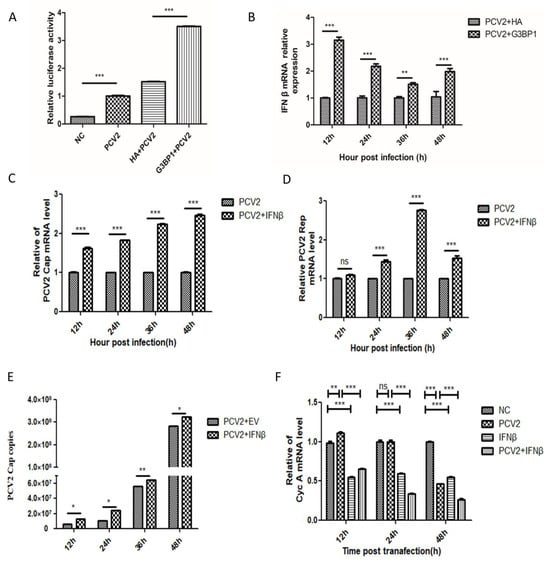 G3BP1 upregulates the expression of RIG-I, MDA5, MAVS, cGAS, and STING induced by PCV2, thereby triggering more intense inflammatory responses and promoting the release of inflammatory factors. Dual fluorescence reporter gene assays conducted in PK15 cells infected with PCV2 demonstrated that the overexpression of G3BP1 significantly enhances IFNβ promoter transcription (Figure 5A). Real-time fluorescence quantitative detection demonstrated that the overexpression of G3BP1 enhanced PCV2-induced IFNβ expression in PK-15 cells infected with an MOI = 1, with the most significant enhancement observed at 12 h compared to the control group (Figure 5B). To further confirm the enhancing effect of IFNβ on PCV2, PK-15 cells were stimulated with 500 ng/mL porcine IFNβ, and the impact on PCV2 Cap and Rep mRNA expression levels, as well as viral gene copy numbers, at different time points was assessed (Figure 5C–E). The results indicate that IFNβ treatment significantly promotes PCV2 replication, with the most pronounced effects observed at 36 and 48 h.
