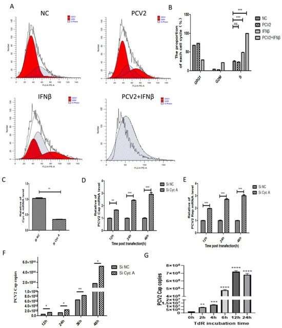 G3BP1 promotes PCV2 replication by triggering IFNβ expression and arresting regulating cell cycle at S stage. (A,B) The effect of PCV2 infection and 500 ng/mL exogenous IFN-β stimulation on the cell cycle of PK-15 cells was detected by flow cytometry. (C) SiRNA silencing efficiency of Cyc A. (D–F) Silencing the expression of Cyc A promoted the transcription of PCV2 Cap and Rep mRNA and the increase in viral copy number. (G) PCV2-infected PK-15 cells were treated with TdR for different time lengths to observe the effect on PCV2 virus copy number. * p < 0.05, ** p < 0.01. *** p < 0.001 “ns” means no statistical significance.