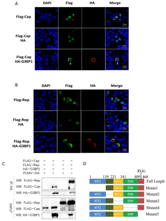 Recent studies have demonstrated that G3BP1 can form liquid-phase bodies within cells. Liquid-phase bodies are dynamic structures composed of various biomolecules, characterized by their ability to dynamically aggregate and disperse dynamically, in contrast to the solid crystalline state or uniformly dispersed solution state [,]. They resemble droplets that can dynamically assemble and disassemble. The interaction between PCV2 Rep protein and Cap protein is critical for the replication and packaging processes of PCV2. During viral replication, Rep protein binds to specific initiation sites on the viral genome, thereby initiating the replication process. Once the replication of the viral genome is complete, the newly synthesized genome is packaged into viral particles by Rep protein and other auxiliary proteins. Cap protein is responsible for forming the viral capsid during this process, encapsulating the replicated genome to form mature viral particles. The interaction between Rep and Cap protein involves not only direct physical interactions but also complex regulatory networks. These include the participation of other auxiliary proteins and regulatory factors within the cellular environment, such as timing of the viral replication process and changes in intracellular conditions. In this context, the different domains of G3BP1 in this paper can interact with viral proteins Cap and Rep proteins. Moreover, G3BP1 can induce the formation of a liquid phase in the cytoplasm, which can form an independent space, which provides favorable conditions for the transport of the virus and escape from the innate immune response within the cell.