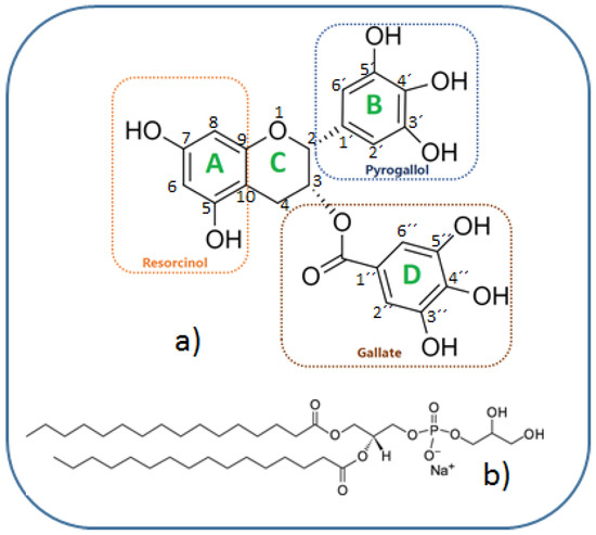 Chemical structures of: (a) EGCG and (b) DPPG.