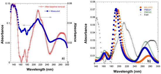 (a) Measured VUV absorption spectrum of EGCG cast film prepared from water solutions; (b) calculated absorption spectra of EGCG in water; 1: 6-31G(d,p), 2: 6-311+G(d,p).