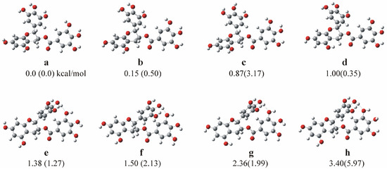 The eight stable isomers of the EGCG molecule can be split into two groups: the first contains the a–d isomers and the second the e–h isomers, where a van der Waals bond H…O between the H of the pyrogallol ring and O of the gallate ring of about 1.98 Å is formed, as shown in Figure 3. The isomers differ in the relative positions of the H atoms of the OH groups. Note that both the pyrogallol and the resorcinol rings rotate with respect to the gallate ring when this type of van der Waals interaction is formed, as shown in Figure 3. These rotations result in an increase in the relative energy of about 0.5 kcal/mol. These eight isomers are lying energetically within 3.4 kcal/mol in water; see Table 2. Note that, in the gas phase, they are all within 6.0 kcal/mol and the relative ordering is different within each of the two groups. However, in both cases, the most stable isomer is the same minimum. Additionally, all used methodologies predicted the same geometry. The dihedral angles between the resorcinol, gallate, and pyrogallol rings in water, dRG, dRP, and dGP are about 117, 92, and 38 degrees for the a–d isomers and change to 155, 98, and 60 degrees for the e–h isomers where the H…O bonds are formed, respectively. Note that the dRP dihedral angle is similar in both groups of the isomers.