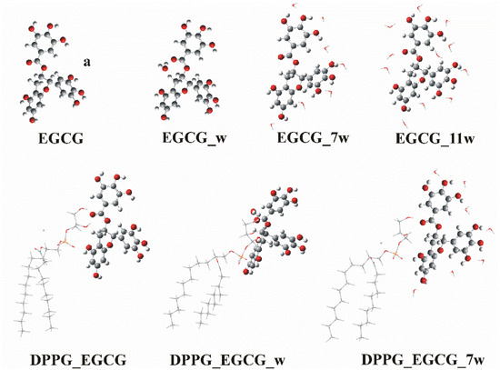 Lowest energy structures of EGCG, EGCG_w, EGCG_7w, EGCG_11w, DPPG_EGCG, DPPG_EGCG_w, and DPPG_EGCG_7w.
