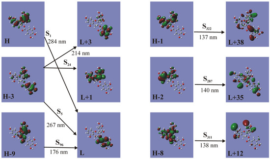 The PBE0/6-311+G(d,p) electron density plots of the frontier orbitals involved in the most important absorption excitations of the EGCG molecule in water are depicted in Figure 5 and Figure A3. In Table 1, the absorption bands and their respective assignments of the electronic transitions observed in the VUV spectra of EGCG in water are presented. The S1 excitation corresponds to a CT state from resorcinol and pyrogallol to gallate. The following three excitations present a similar character to that of S1. S5, which presents a high oscillator strength, corresponds to the n-π* transition involving oxygen electrons from gallic acid, i.e., the excited electron remains in the gallate group. At 200 nm, there are peaks with high oscillator strengths where the electron is located to resorcinol, gallate, or resorcinol groups. At 140 nm, partial CT states exist, where electron transfer is observed from resorcinol–pyrogallol groups to different smaller groups of the EGCG molecule.