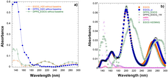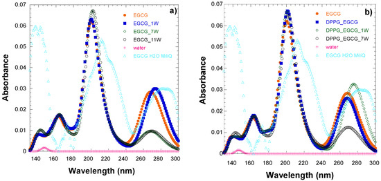 The VUV characterization of DPPG emulsions and thin films was carried out and the absorbance spectrum of DPPG thin films shows four bands at A) 138.2 ± 0.4, B) 145.8 ± 0.4, C) 169.8 ± 0.3, and D) 192 ± 2 nm [59]. These were assigned to: A) the πC=O→π∗CO transition; B) to the phosphate group transitions; C) to several assignments as the second lone pair orbital on the carbonyl group oxygen, a transition in the carboxyl group, the promotion of an electron from the highest filled molecular orbital to an antibonding orbital of O-H, and water dissociation; D) either to the n′O→π∗CO transition from the lone pair on the carbonyl oxygen to the antibonding πCO valence orbital or to the valence shell electronic excitations of hydroxyl groups [55]. Therefore, as one would expect, the VUV spectrum of DPPG-EGCG is quite like the one of EGCG, as observed in Figure 7a, which presents the obtained VUV spectra of EGCG and DPPG-EGCG cast thin films prepared from aqueous solutions or emulsions.