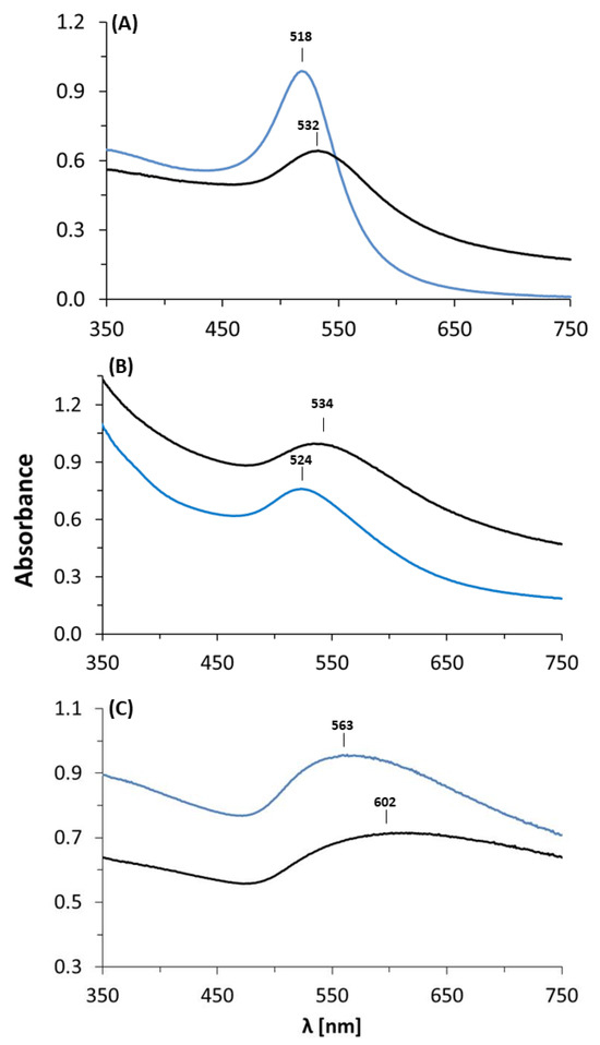 Au(III) in HAuCl4 has a high reduction potential and can be reduced by appropriate compounds. In this study, we synthesized gold nanoparticles (AuNPs) with citrates (citr), as previously described in Section 3.4.2, and 3-mercaptoproponic acid (MPA), as previously described in Section 3.4.1, which facilitates the donation of electrons to the metal, reducing Au3+. The effective binding and interaction between substrates and gold nanoparticles were additionally confirmed through UV–Visible spectroscopy, as illustrated in Figure 2. The formation of AuNPs-citr and AuNPs-MPA was confirmed by the color change and the presence of the localized surface plasmon resonance (LSPR) band, which occurs on the surface of some metals at the nanometer scale. The absorption intensity and peak position of LSPR spectra strongly depend on the morphology, size, shape, and accumulation of AuNPs. The spectral analysis distinctly indicates that the surface modification of the nanoparticles occurred, as evidenced by a notable redshift in the localized surface plasmon resonance (LSPR) position when compared to citrate-stabilized nanoparticles. UV-Vis spectroscopy demonstrated a peak at 518 nm for AuNPs-citr. This peak shifted to 532 nm due to citrate exchange for TDG, which simultaneously confirmed the effectiveness of the exchange (Figure 2A black line). The 524 nm peak was observed for AuNPs-MPAm1 (Figure 2B blue line), which indicated small nanoparticles compared to AuNPs-MPAm2 (Figure 2C blue line), showing a broad peak at 563 nm (Figure 2C blue line). Therefore, it was intriguing to further characterize the AuNPs-MPAm1 and AuNPs-MPAm2 samples in order to explain the differences in UV-Vis spectra.