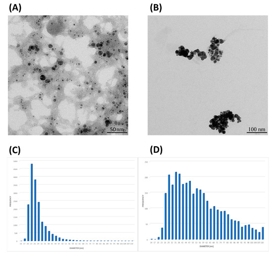 Figure 3. The morphologies of the synthesized AuNP-MPA. Comparison of characteristics obtained in TEM and SP-ICP-MS. (A,B) TEM image of AuNP-MPAm1 and AuNP-MPAm2, respectively (C,D) SP-ICP-MS particle size distribution of AuNP-MPAm1 and AuNP-MPAm2, respectively.