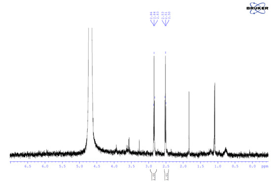 The 1H NMR spectra of the studied AuNPs-MPA samples were measured using a Bruker AVANCE III HD spectrometer at the 500 MHz transmitter frequency for 1H. The sample was dissolved in deuterated water (D2O). Standard measurement parameters were used with the number of scans equal to 256. The 1H NMR spectra were measured at a temperature of 298 K. The residual signal of the solvent was simultaneously the internal standard of the chemical shift (4.70 ppm).