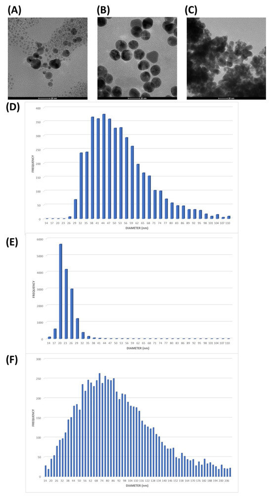 TDG was loaded on AuNPs following the methods described in Section 3.4.2. Figure 5 shows that AuNPs-MPAm1-DG and AuNPs-TDG were well crystallized, spherical in shape, without particle accumulation, and exhibiting an average particle diameter of 53.3 nm and 21.6 nm, respectively. Figure 5 shows that AuNPs-MPAm2-DG exhibited a spherical shape but with particle accumulation and had an average particle diameter of 93.2 nm. This trend was observed as early as the creation stage of AuNPs-MPAm2. It is possible that some nanoparticle accumulation was caused by steric effects and electrostatic forces between DG and AuNPs-MPA surfaces. During the preparation of samples for Transmission Electron Microscopy (TEM), it is plausible that the solvent’s evaporation contributed to nanoparticle accumulation. Therefore, particle sizes are reported from the SP-ICP-MS technique and commented on below.