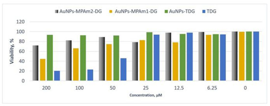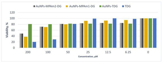 Table 2 summarizes the ζ-potential of all the products. The ζ-potential of AuNPs delivers information regarding the surface charge of the nanoparticles. The nanoconjugate value of the ζ-potential was found equal to −21.8 mV for AuNPs-TDG, −30.1 mV for AuNPs-MPAm1-DG, and −22.7 mV for AuNPs-MPAm2-DG. All samples have a negative potential charge. The data suggest that all samples demonstrated stability. Consequently, it can be proposed that these nanoparticles will maintain their stability in future in vivo studies following intravenous administration. In general, colloidal solutions were stabilized by DG/MPA loading onto the AuNPs. Therefore, all samples from three different synthesis routes were selected for further biological studies.