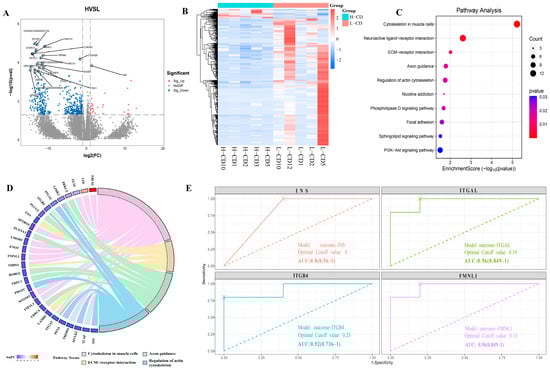 The differentially expressed genes (DEGs) were identified between two groups according to the cutoff threshold of |log2FC| ≥ 1 and p < 0.05. Compared to the low rate of CD group, the seminal plasma exosomes of the high group contained 486 DEGs, of which 33 were up-regulated, and 453 were down-regulated (Figure 2A). A heatmap shows significantly different transcriptomic patterns of DEGs between the two groups (Figure 2B). These DEGs were mainly enriched in multiple pathways of interest, including cytoskeleton in muscle cells, regulation of actin cytoskeleton, ECM–receptor interaction, and axon guidance pathways (Figure 2C,D). Moreover, a small number of DEGs were enriched in the phospholipase D signaling pathway and PI3K–Akt signaling pathway (Figure 2C). It indicated that all of these differentially enriched pathways may be involved in the progression of CD shedding, but the regulation of cytoskeleton may play a crucial role. Interestingly, the down-regulation of the insulin gene INS, which was involved in the above functions, may directly affect insulin signaling (Figure 2D). Consequently, we performed ROC analyses and calculated area under the curve (AUC) of related DEGs to verify their potential. The AUCs for ITGAL, ITGB4, FMNL1, and INS were 0.96, 0.92, 0.96, and 0.8, respectively, indicating that these cytoskeleton-related DEGs can be used as markers to determine whether boar spermatozoa have high or low rates of residual cytoplasmic droplets (Figure 2E).