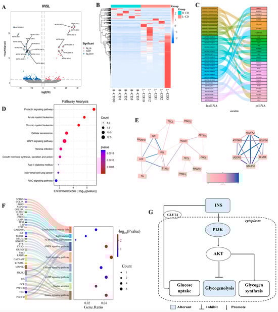 lncRNAs profile of seminal plasma exosomes in semen containing low or high rates of sperm with CDs. (A) Volcano map of 503 DElncRNAs between the high CD rate group and low CD rate group. (B) Heatmap of DElncRNAs. (C) Prediction of target genes for DElncRNAs. (D) KEGG pathway enrichment analysis of DElncRNAs target genes. The top 10 significant pathways are displayed. (E) Core interaction network modules for the target genes of DElncRNAs. (F) Demonstration of target genes enriched in key pathways. (G) Schematic diagram of the insulin signaling pathway. In the figure, the relevant genes in the pathway represented in blue are the target genes of the DElncRNAs.