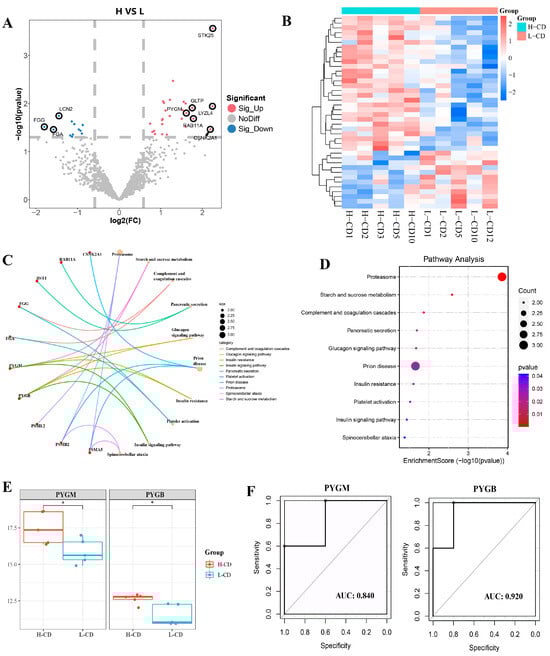 Seminal plasma exosome DEPs in semen containing low or high rates of sperm with CDs. (A) Volcano map of 40 DEPs between the high CD rate group and low CD rate group. (B) Heatmap of DEPs. (C) DEPs enriched in the pathways. (D) KEGG pathway enrichment analysis of DEPs between the high CD rate group and low CD rate group. The top 10 significant pathways are displayed. (E) The expression levels of PYGM and PYGB. * p < 0.05 (F) ROC analyses of verified PYGM and PYGB proteins.