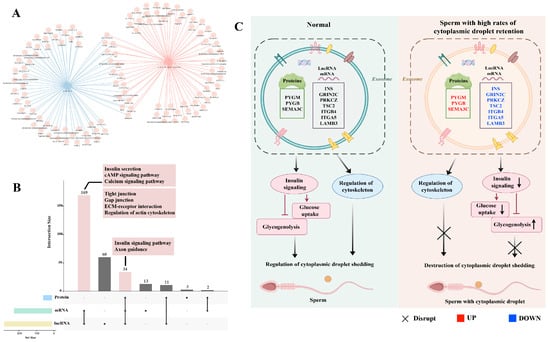 Integrative multi-omics data analysis, including DEGs, DEPs, and DElncRNAs. (A) Venn analysis of DEGs, DEPs, and DElncRNA. (B) Venn analysis of KEGG pathways from DEGs, DEPs, and DElncRNA. (C) We hypothesize that exosomes are involved in the migration and shedding of sperm cytoplasmic droplets by acting on cytoskeleton and insulin signaling. Blue color represents down-regulation of expression in the high residue group, red color represents up-regulation of expression in the high residue group (by Figdraw).