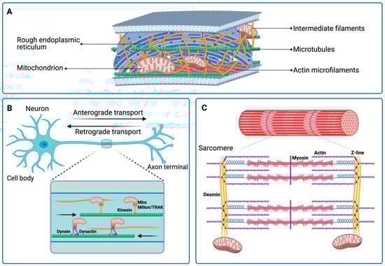 Schematic representation of the cytoskeletal organization (A) and cytoskeletal–mitochondria interactions in a neuron (B) and the sarcomere (C). Created in https://BioRender.com.