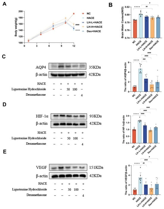 Effect of LH pre-administration on HACE model. (A) Weight modifications in every group. (B) Water content in the brain for each group. (C–E) Western blot analysis of HACE-related protein expression (left) and quantitative analysis (right). The values are presented as mean ± SEM (n = 7). **** p < 0.0001 when compared to the NC group; # p < 0.1, ## p < 0.01, ### p < 0.001, and #### p < 0.0001 when compared to the HACE group.