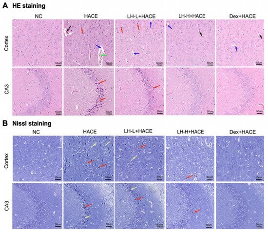 LH protected the structure of brain tissue and neurons in the HACE model. Representative photomicrographs illustrating morphological changes in brain tissues using HE staining (A) and Nissl staining (B). Bar = 50 um, magnification 20× (“→” black for vascular congestion; blue for widening of perivascular space; green for vasodilation; red for crumpling of neuronal cells; yellow for lysis of nuclear membrane or nucleoli).