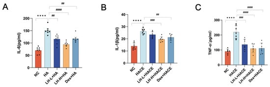 LH alleviates inflammation in HACE model. (A–C) Serum levels of IL-1β, TNF-α, and IL-6 were measured across all groups. Values are expressed as mean ± SEM for n = 7. **** p < 0.0001 vs. NC group; ## p < 0.01, ### p < 0.001, #### p < 0.0001 vs. HACE group.