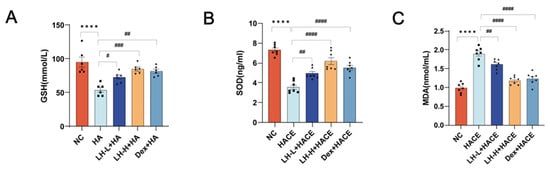 LH reduced oxidative stress in the HACE model. (A–C) The blood serum levels of GSH, SOD, and MDA for each group. Values are expressed as mean ± SEM for n = 7. **** p < 0.0001 vs. NC group; # p < 0.1, ## p < 0.01, ### p < 0.001, #### p < 0.0001 vs. HACE group.