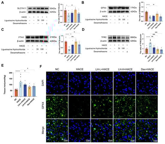 LH prevented ferroptosis in HACE rats. (A–D) Western blot analysis (left) and quantitative analysis (right) of the expressions of ferroptosis-related proteins. (E) Tissue iron in each group. (F) GPX4 representative image of immunofluorescence section of brain tissue (magnification 100×, scale = 25 μm). Values are expressed as mean ± SEM for n = 7. Significance levels are indicated as follows: **** p < 0.0001, * p < 0.1 compared to the NC group; # p < 0.1, ## p < 0.01, ### p < 0.001, #### p < 0.0001 compared to the HACE group.